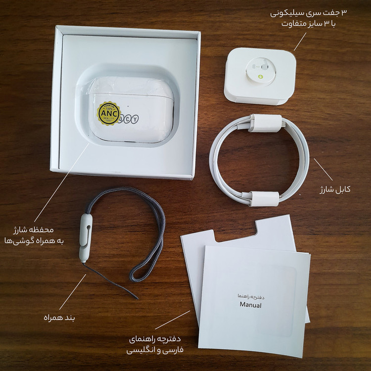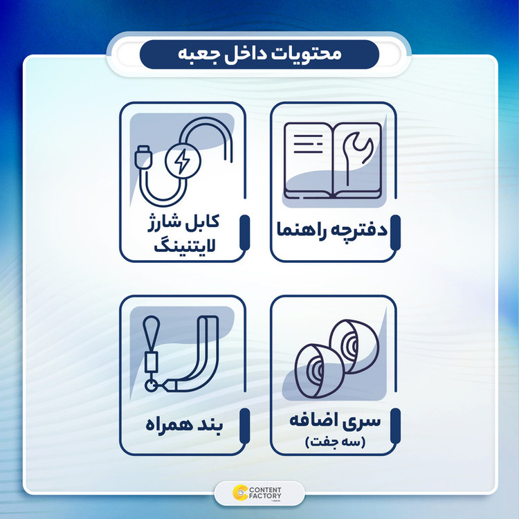 کابل شارژ لایتنینگ - بند همراه - دفترچه راهنمای فارسی و انگلیسی - 3 جفت سری سیلیکونی نرم با 3 اندازه متفاوت